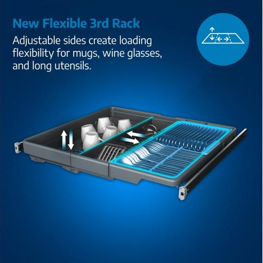 The Flexible Third Rack elevates the standard and adjustable cutlery tray, featuring adaptable and removable sides to fit wine glasses up to 24cm in the upper basket and mugs up to 7cm in the third rack. With a special zone for long utensils and height adjustability, it maximises loading space and flexibility.