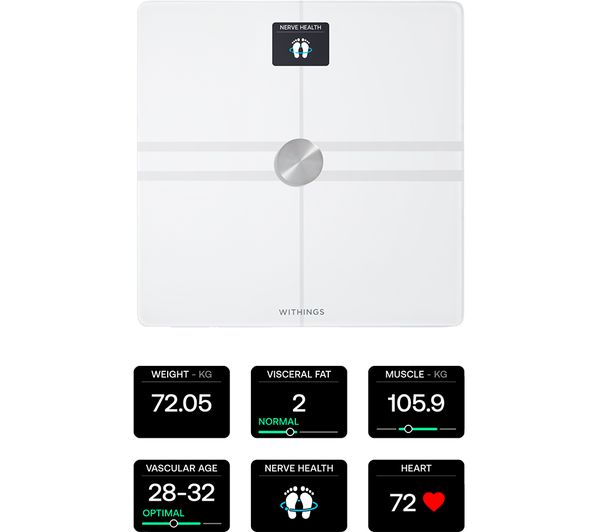 Withings Body Comp is an advanced smart scale that offers full body composition, cardiovascular health insights, and nerve health assessment — all in one sleek device.