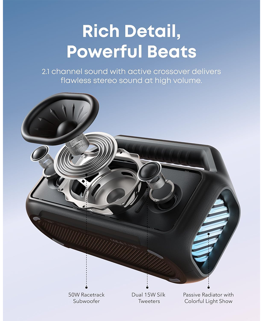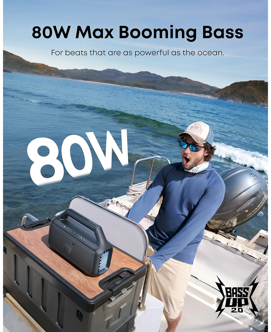 - 80W Max Booming Bass: Feel the power of the bass in every song thanks to a racetrack subwoofer for added depth and clarity. And with BassUp️ 2.0, you can tweak the bass EQ and increase the output from 60W to a staggering 80W max.
