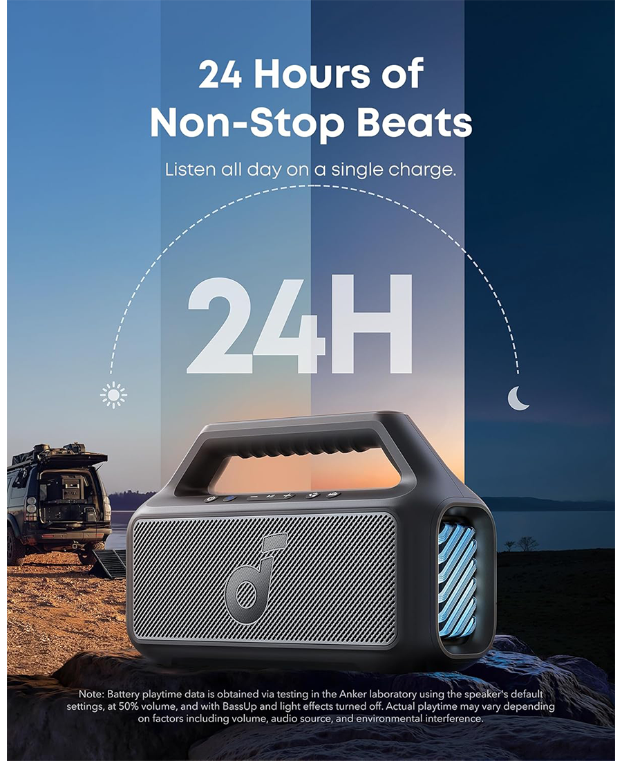 - Listen All-Day Anywhere: Boom 2 Bluetooth Speaker keeps the beats playing for 24 hours on a single charge, and with the built-in power bank, you can keep your phone powered up wherever you are. (Playtime may vary based on volume level and playback content.)