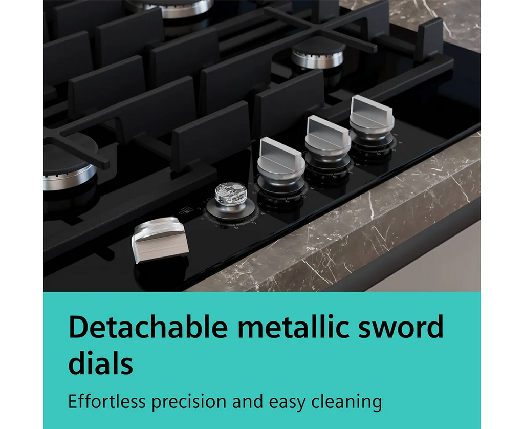 Tempered glass gas hob with stepFlame Technology for precise flame control, with detachable dials and semi-continuous pan supports for an easy cleaning.