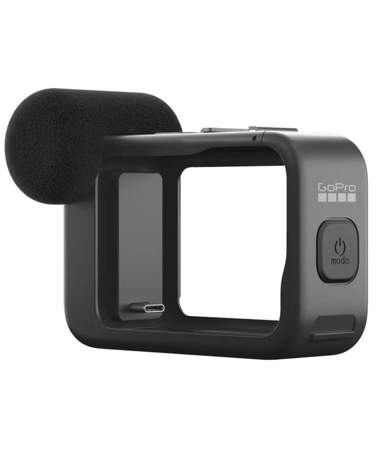 Designed for vlogging, live streaming and near limitless expansion—Media Mod transforms your HERO camera into a production powerhouse. It features a built-in directional mic for enhanced voice capture, 3.5mm mic port, HDMI-out for playback on external monitors, plus two cold-shoe mounts for lights, LCD screens or additional mics. Built tough and weather-resistant, even the wind is no match for this mod. The removable foam mic cover suppresses wind gust up to 20 mph (32 kph).