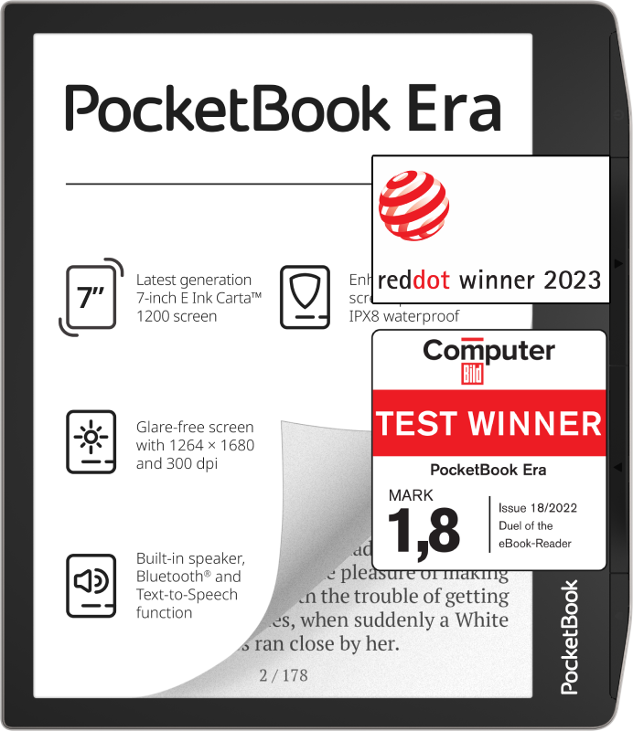 Built for everyday convenience, the PocketBook Era combines advanced E Ink display technology with adjustable SMARTlight illumination so you can read comfortably day or night. With audiobook support and built-in audio features, it also doubles as an entertainment device for listening to stories, podcasts, or music on the go.