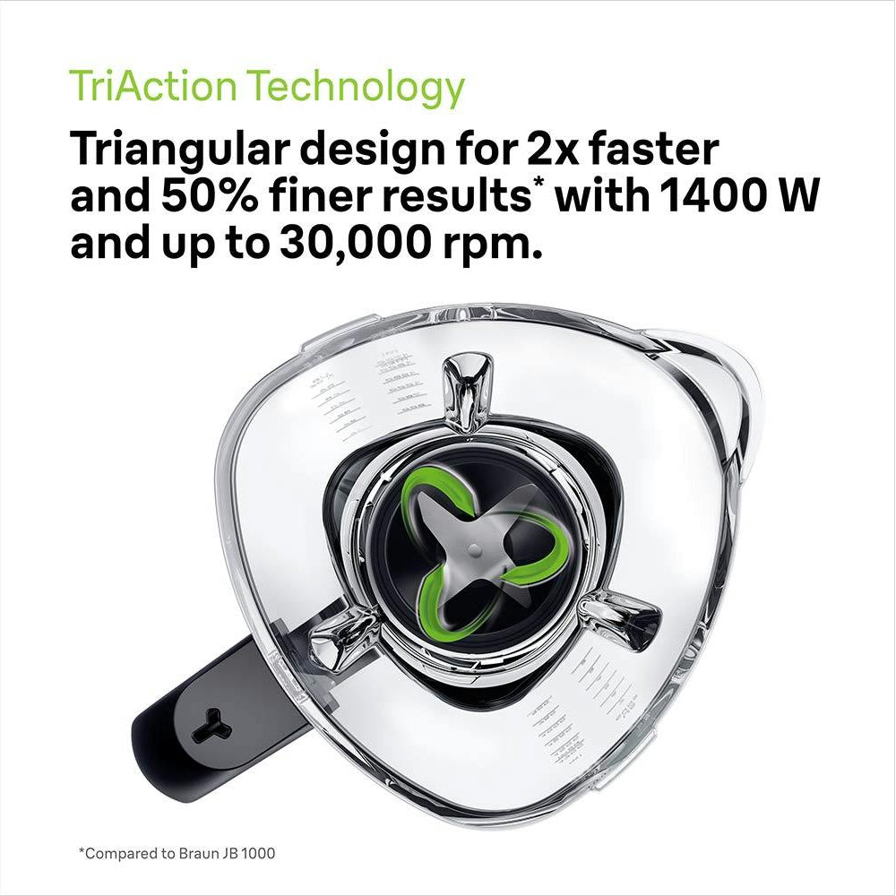 50% finer and 2x faster.* Thanks to the uniquely engineered triangular-shaped jug that ensures ingredients get redirected faster to the blending areas. *Compared to Braun JB 1000.