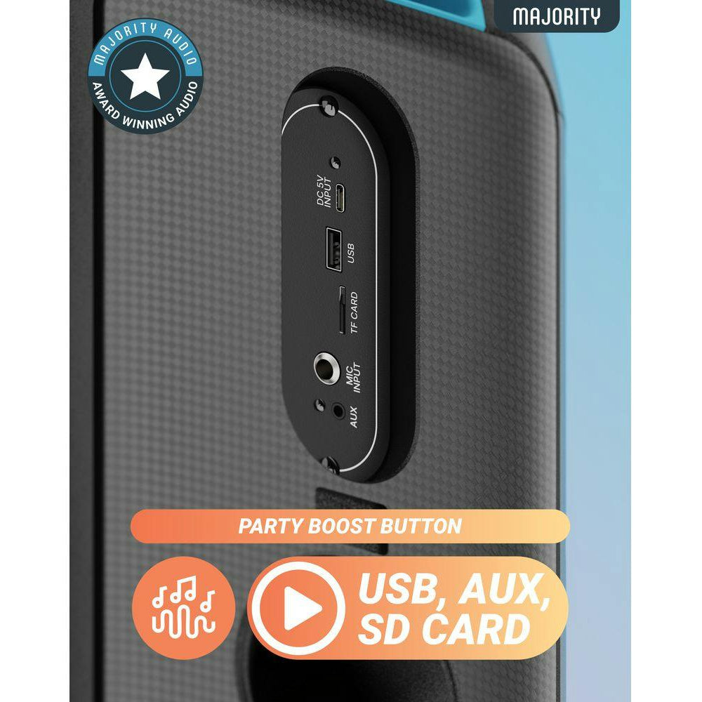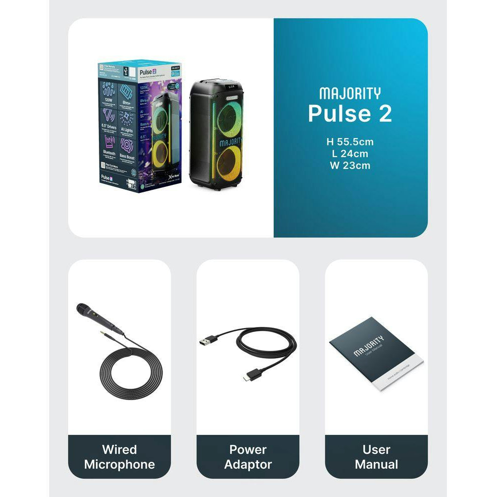 Bring the party to life with the Pulse 2 Speaker - 120W of booming sound, dual 6.5" drivers for deep bass, and vibrant Al lights. Enjoy wireless Bluetooth, TWS pairing, USB/AUX/SD playback, 8-hour battery, and a wired microphone for karaoke fun.