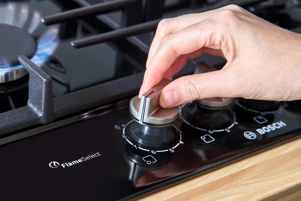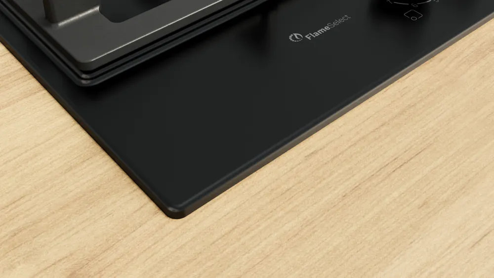 The gas hob with precise flame control and easy cleaning thanks to detachable metallic dials and dishwasher suitable cast iron pan supports.